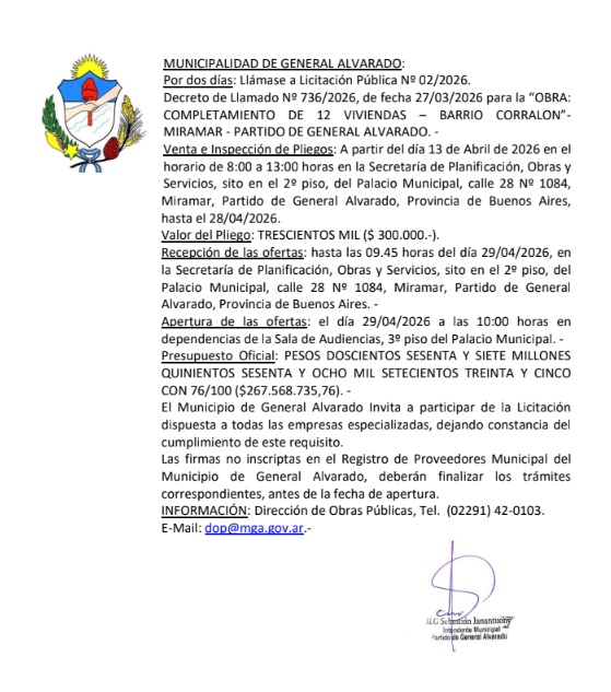 Por dos días: Llámase a Licitación Pública Nº 02/2026. Decreto de Llamado Nº 736/2026, de fecha 27/03/2026 para la “OBRA: COMPLETAMIENTO DE 12 VIVIENDAS – BARRIO CORRALON”- MIRAMAR – PARTIDO DE GENERAL ALVARADO. –