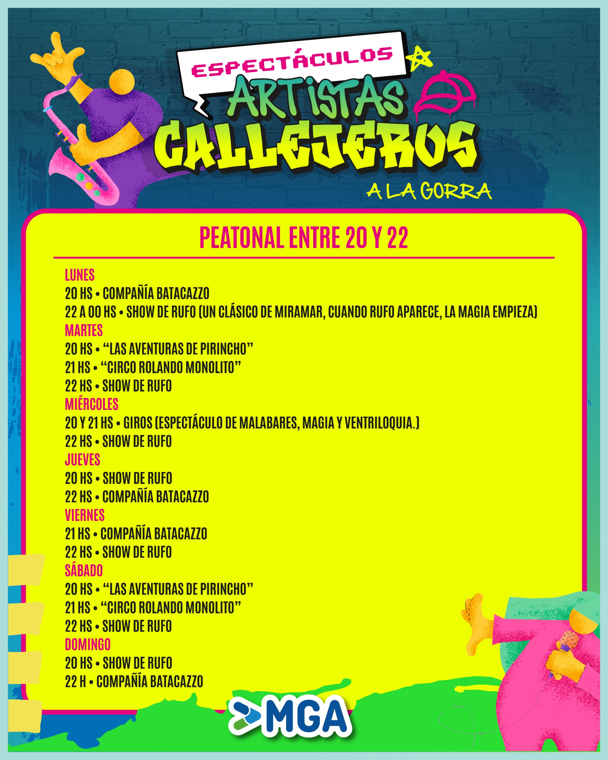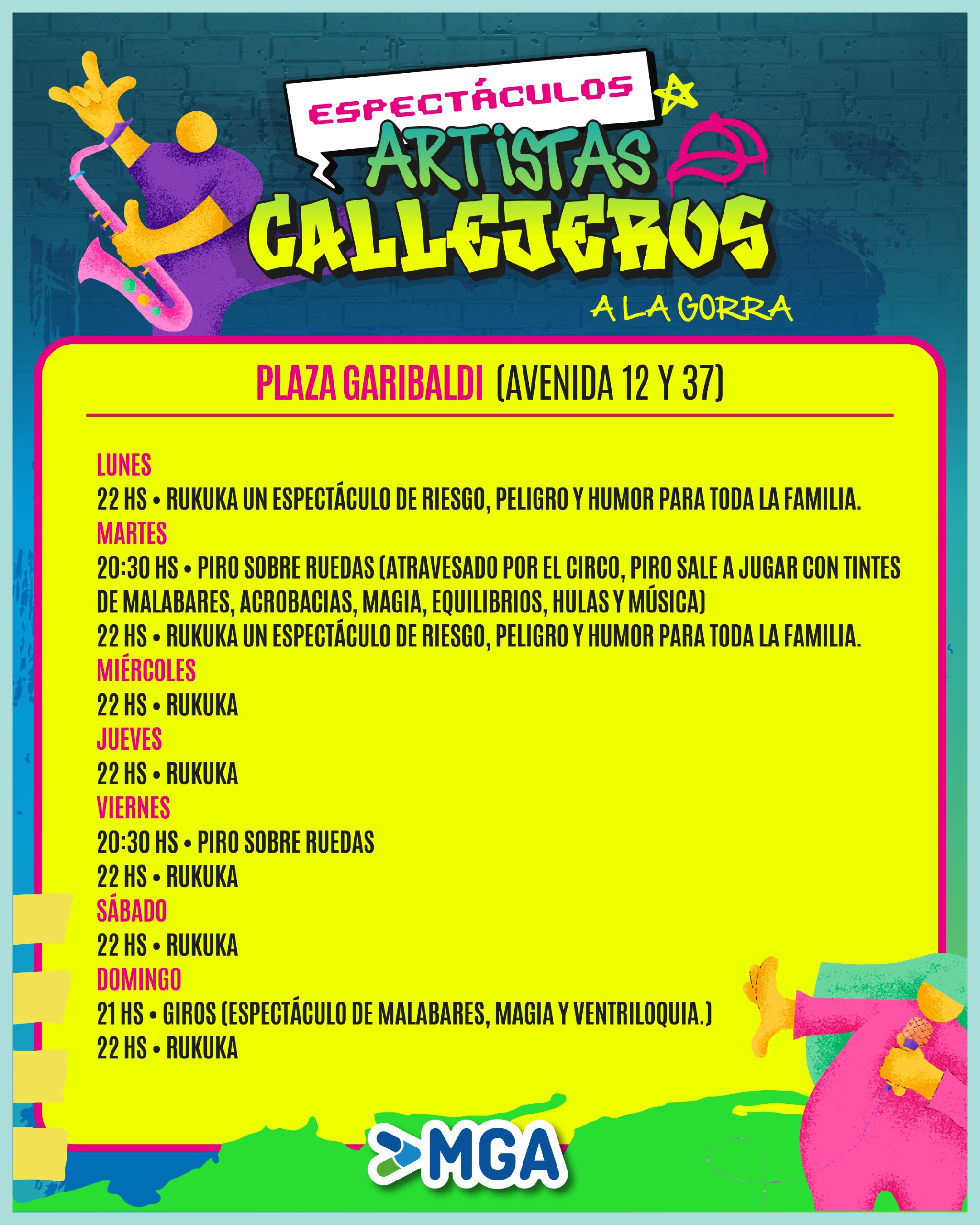 22.00 y 23.00hs Giros (Espectáculo de Malabares, magia y ventriloquia.)