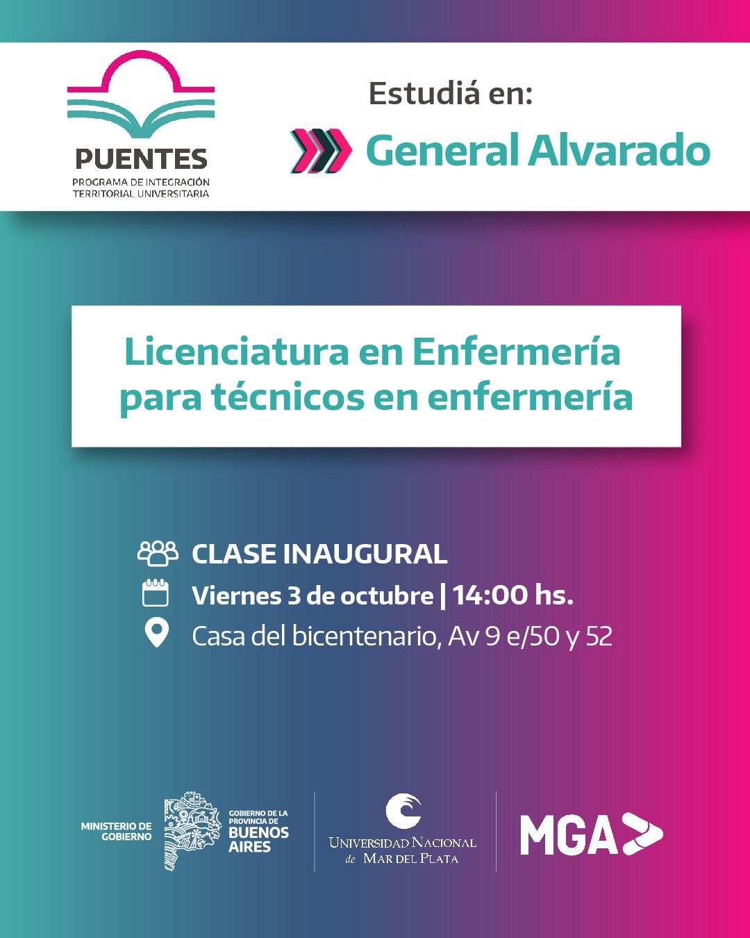 La clase inaugural será este viernes 3 de Octubre a las 14:00 hs en la Casa del Bicentenario (Av. 9 e/ 50 y 52, Miramar). Este nuevo trayecto formativo permitirá a los y las enfermeras técnicas continuar su desarrollo académico, ampliar sus conocimientos y abrir nuevas puertas en el ámbito laboral y de la salud.