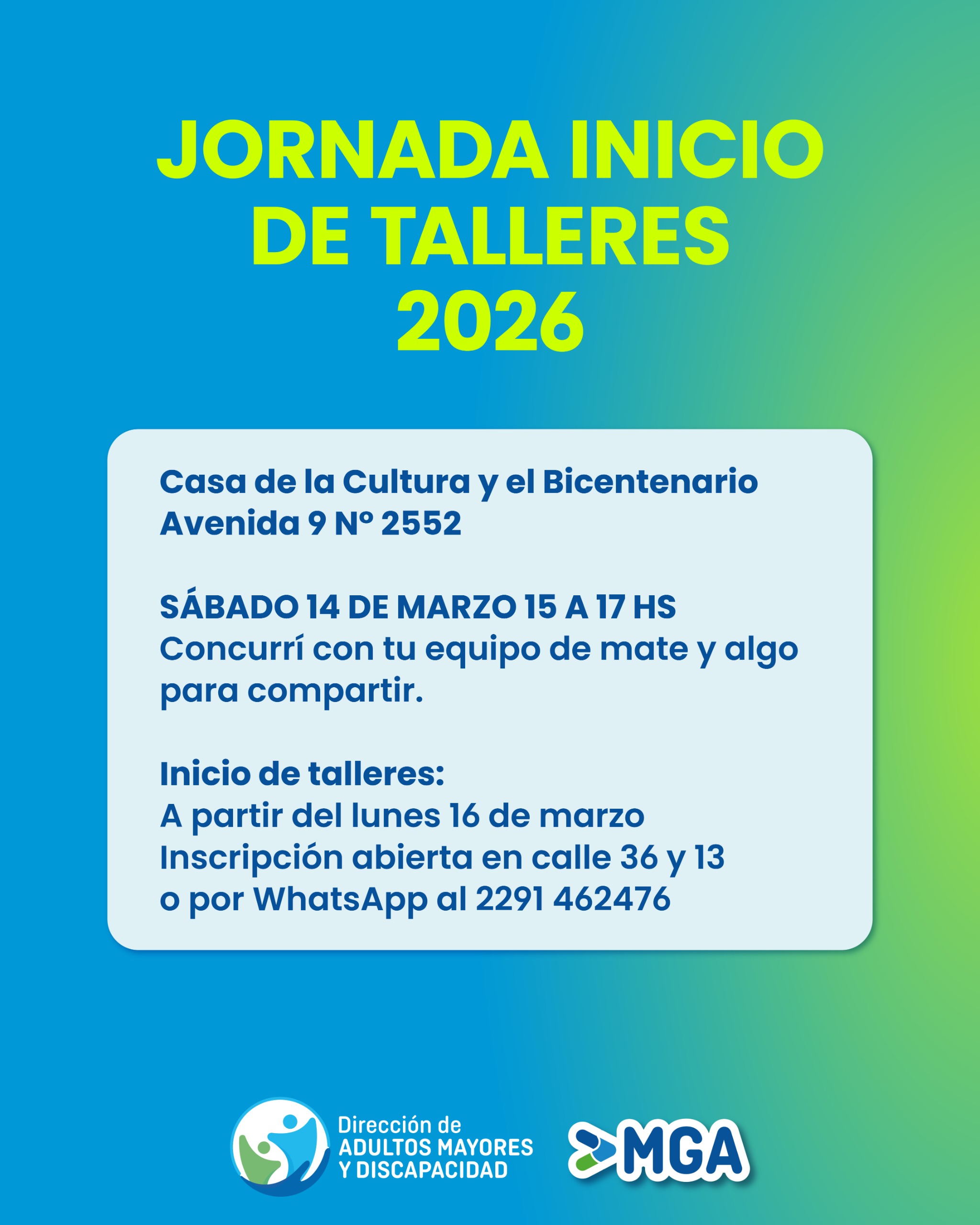 La Dirección de Adultos Mayores y Discapacidad MGA ofrecen para este 2026 una vasta oferta de talleres y actividades para Adultos Mayores en diversas localidades de nuestro distrito.